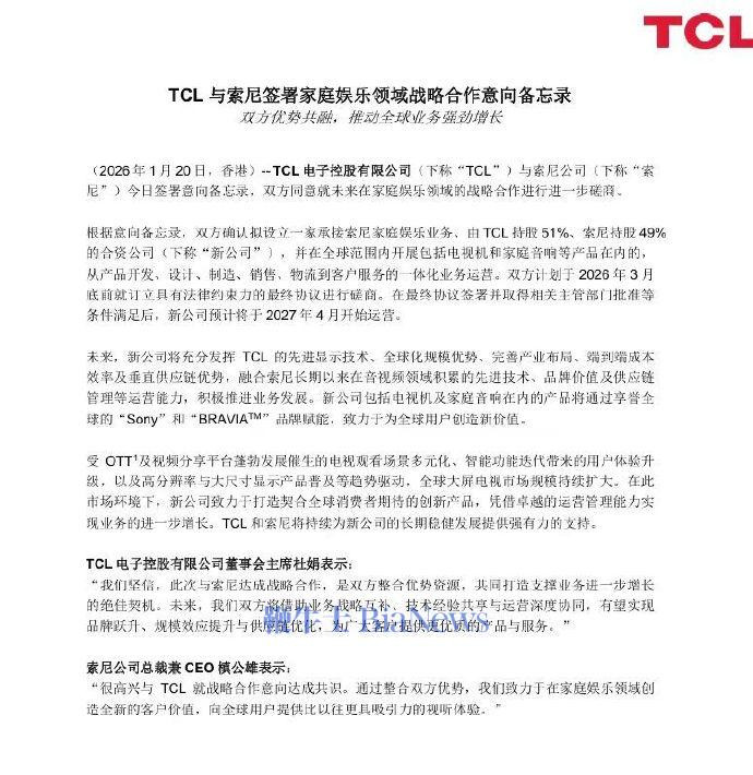 根据意向备忘录,双方确认拟设立一家承接索尼家庭娱乐业务、由TCL持股51%、案尼持股49%的合资公司,并在全球范围内开展包括电视机和家庭音响等产品在内的,从产品开发、设计、制造、销售、物流到客户服务的一体化业务运营。