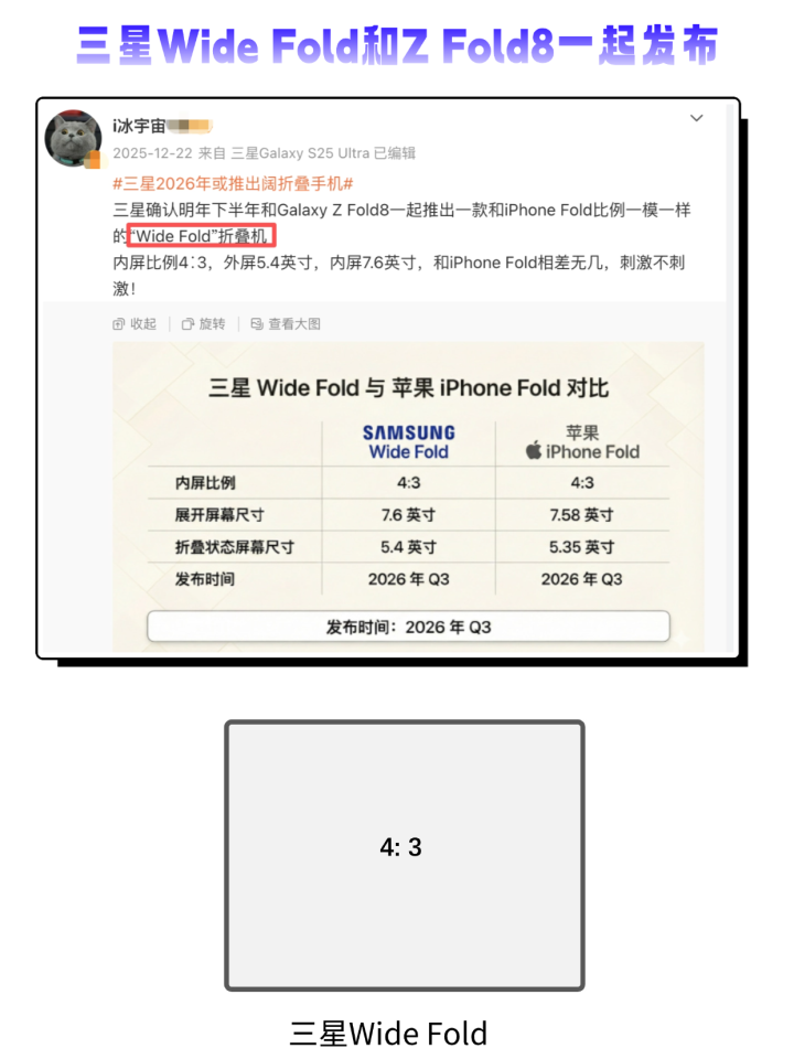 三星Wide Fold的屏幕比例是4:3,和苹果折叠屏相差无几,甚至发布时间和苹果很近,目前三星在折叠屏领域深耕多年,前段时间还推出了三折叠,三星Wide Fold估计也很不错;还有就是Z Fold8网传会有5000mAh大电池和手写笔,7很薄很强但遗憾就是这两,期待!