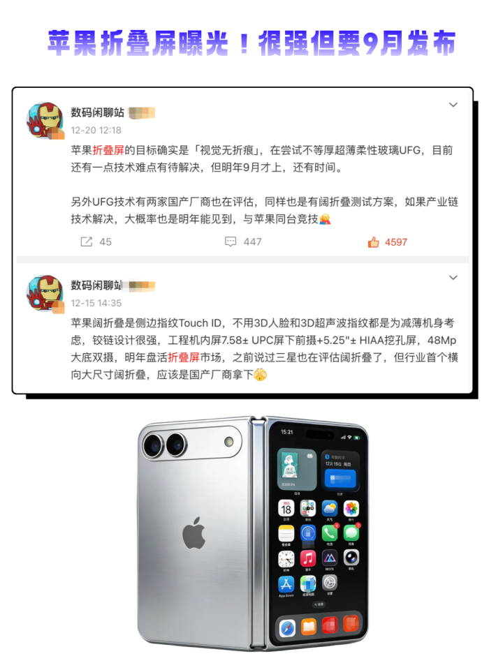苹果折叠屏一来就搞不一样,尺寸不同其他主流大折,而是矮胖造型,像是华为Pura X2放大版,或者说像小iPad mini,可以期待的点是「视觉无折痕」,毕竟苹果是完美主义者,但据说还没稳定做到,9月发布应该不成问题,但后续量产估计有点悬。