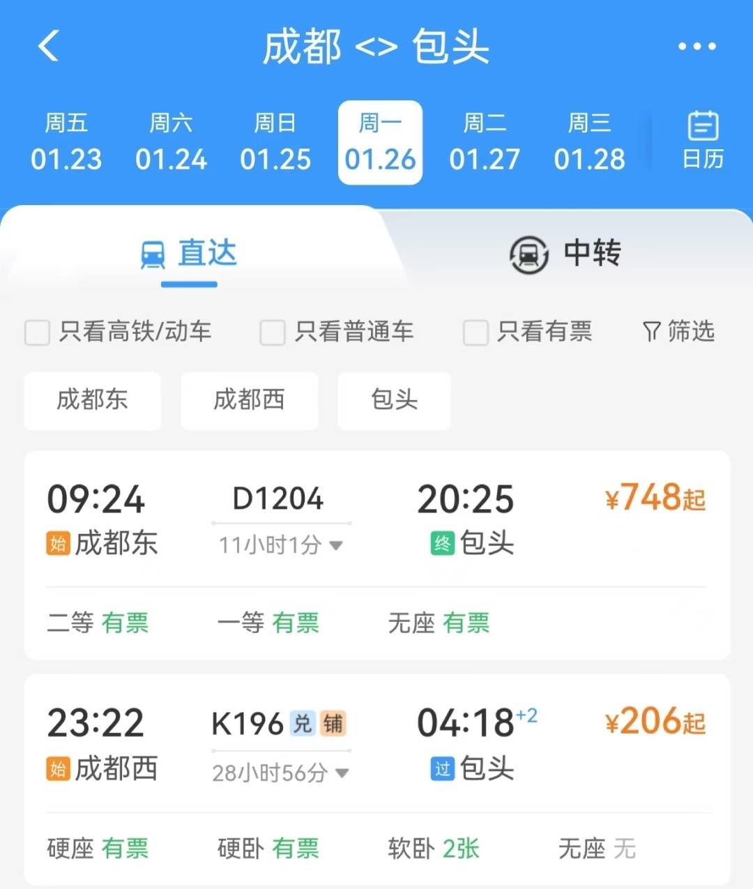 依托包银高铁开通运营,首开成都东至包头动车1对,打通西南与西北快捷通道。目前,1月26日成都东至包头的动车票已开售,11小时1分即可抵达。