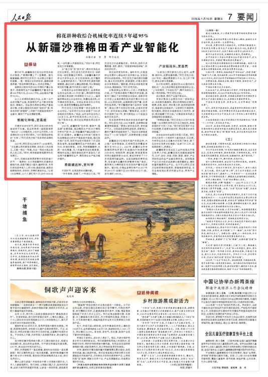 《人民日报》(2026年01月16日第07版)棉花耕种收综合机械化率连续5年超95%