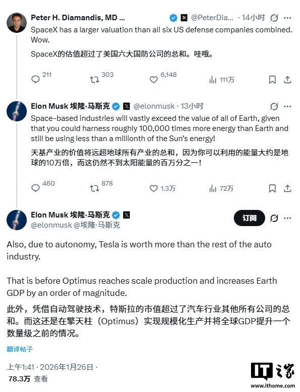 IT之家1月26日消息天成创亿,埃隆·马斯克阐述了他认为特斯拉和SpaceX终将远超竞争对手的原因,指出自动驾驶、机器人技术以及天基能源这三大力量将从根本上重塑经济规模。